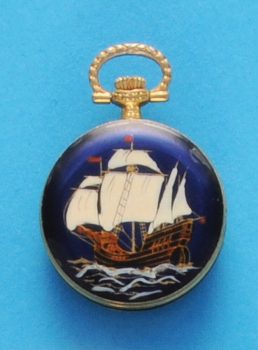 Precimax, kleine vergoldete Email-Damen-Taschenuhr mit Darstellung eines historischen Segelschiffes,