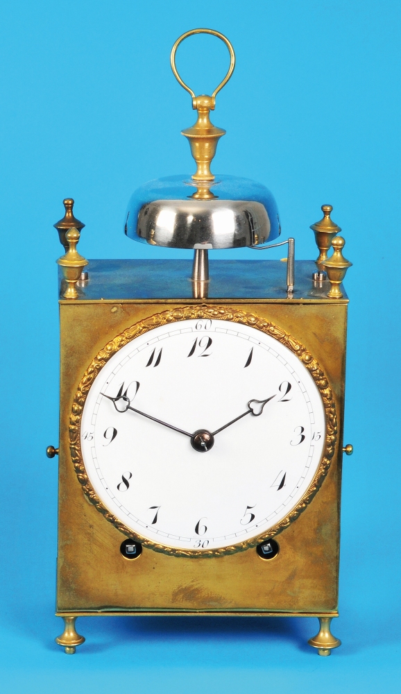 mit seitlichen Türen geschlossenes Messinggehäuse mit über dem Werkdach angeordneter Glocke mit Tragbügel,