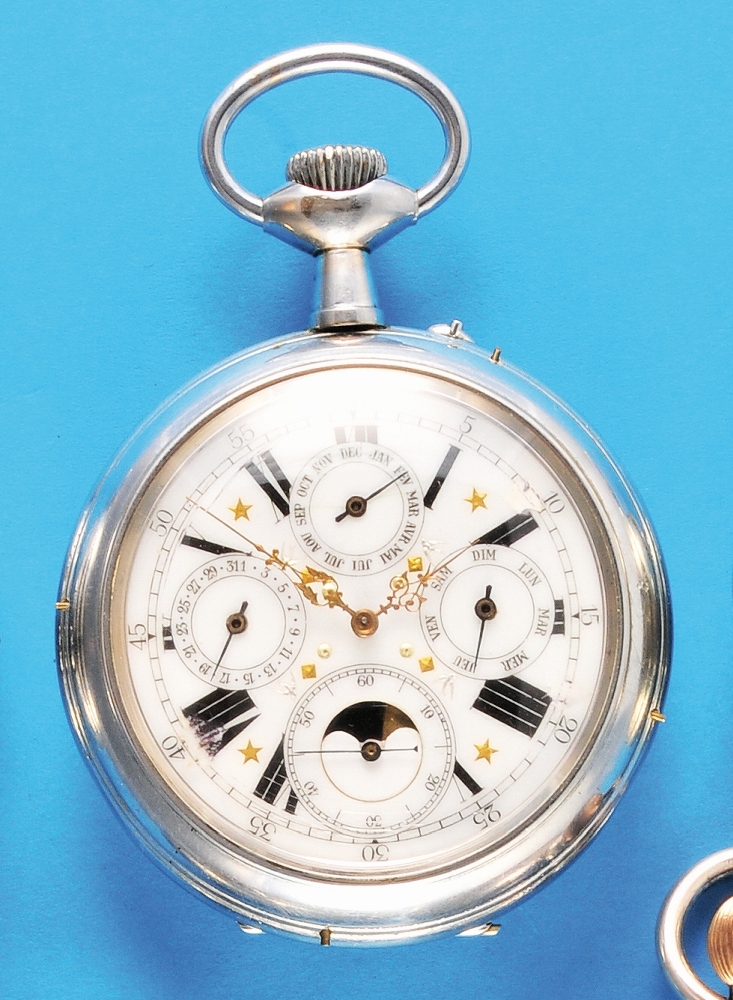 glattes Gehäuse, Emailzifferblatt (bei „2“ und „8“ restauriert) mit römischen Zahlen und Golddekor, arabische Minuterie, vergoldete Zeiger, kleine Sekunde mit Fenster für die Mondphase bei „6“, Skalen für Wochentage bei „3“, Datum bei „9“ und Monate bei „12“, weißes Brückenwerk mit Ankergang, sehr große Kompensationsunruh mit Breguet-Spirale, um 1910, intakt (Mondphase läuft nicht mit), (1609), D = 79 mm